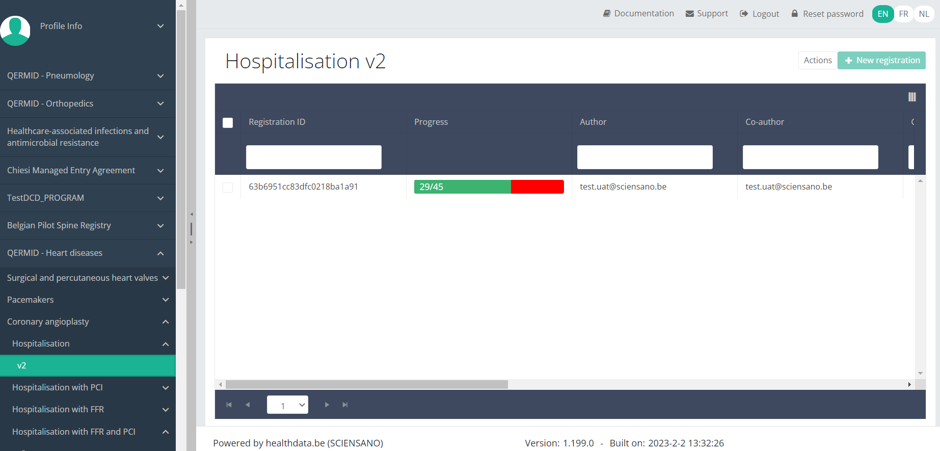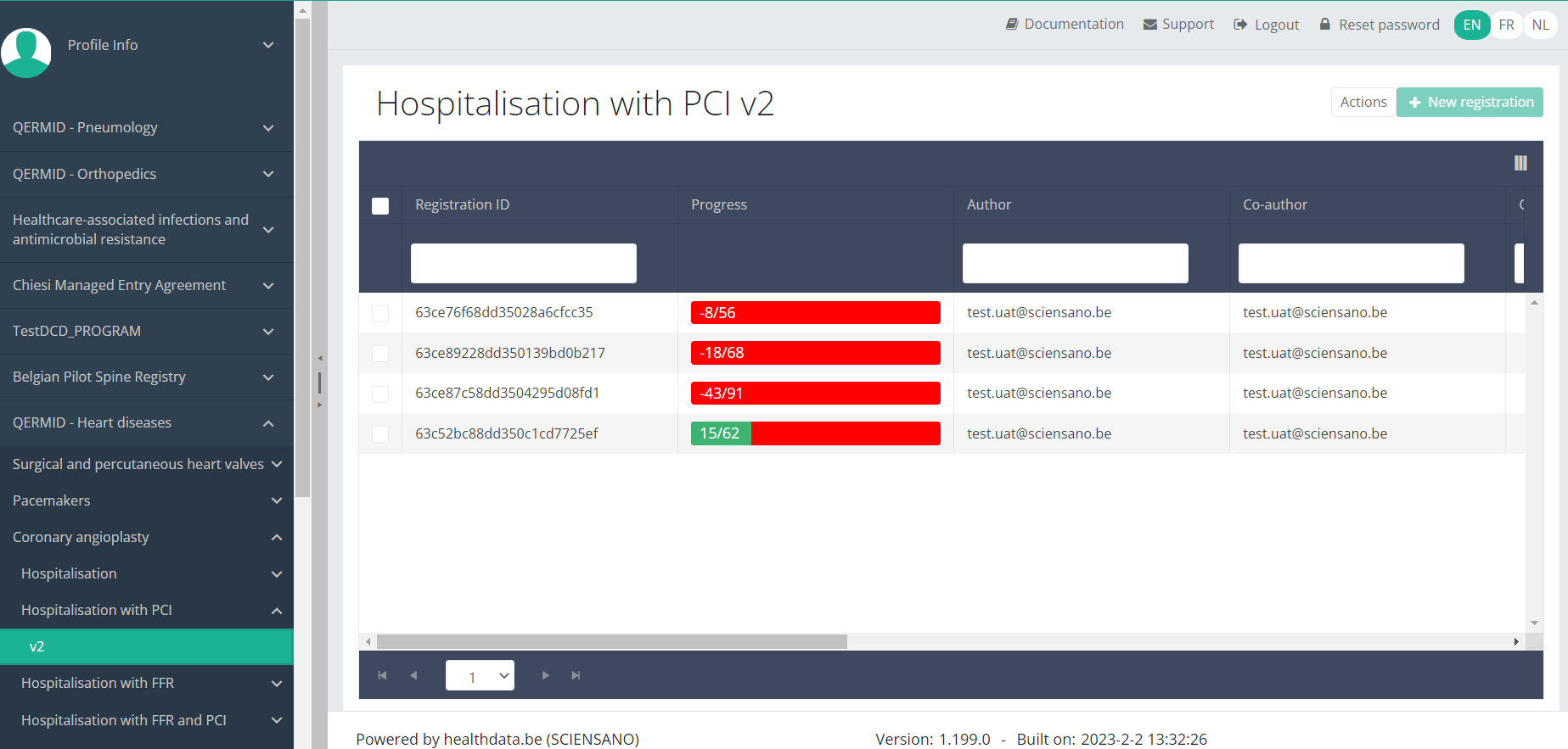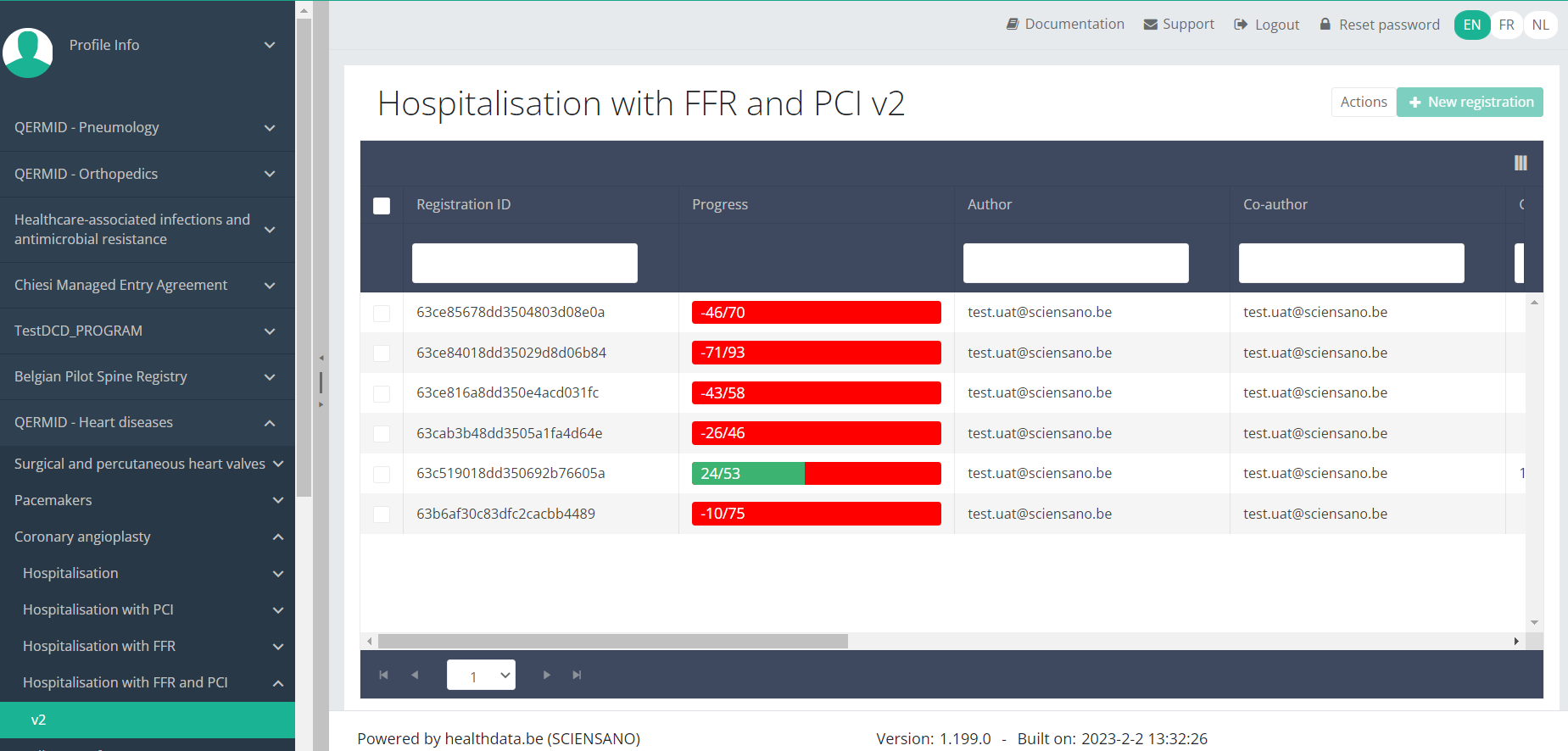 When you select a version of this study section , you will see the overview table in the main part of your screen. The table contains, among others, the following items: Registration ID, Progress, Author, Co-author, Unique ID, Business key, Registration code, National registry ID of the patient...