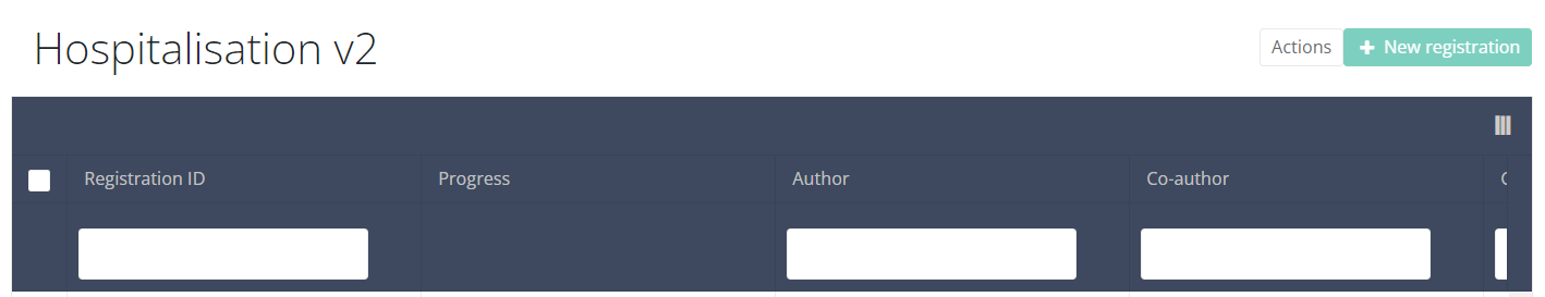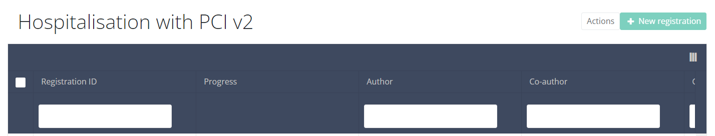 When you select the highest version of this study section for the first time, you will see an empty overview table in the main part of your screen. The table contains, among others, the following items: Registration ID, Progress, Author, Co-author, Unique ID, Business key, Registration code, National registry ID of the patient...