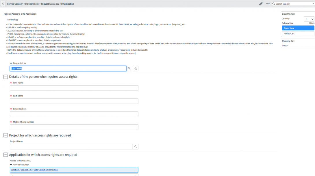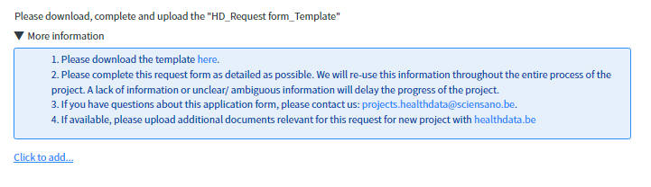 - Service Request: Request for an healthdata.be basic service (e.g. request for information, request for new project, request for access to an application, …).