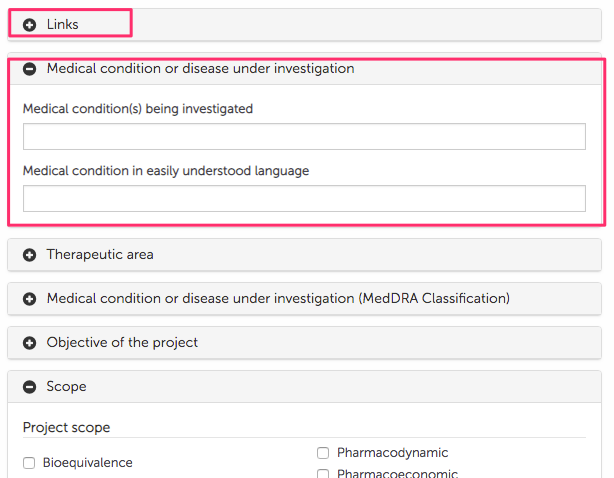 Some project fields are further grouped into foldable fieldsets, which are recognisable by a grey panel with a plus / minus sign (to open / close, just click on it).