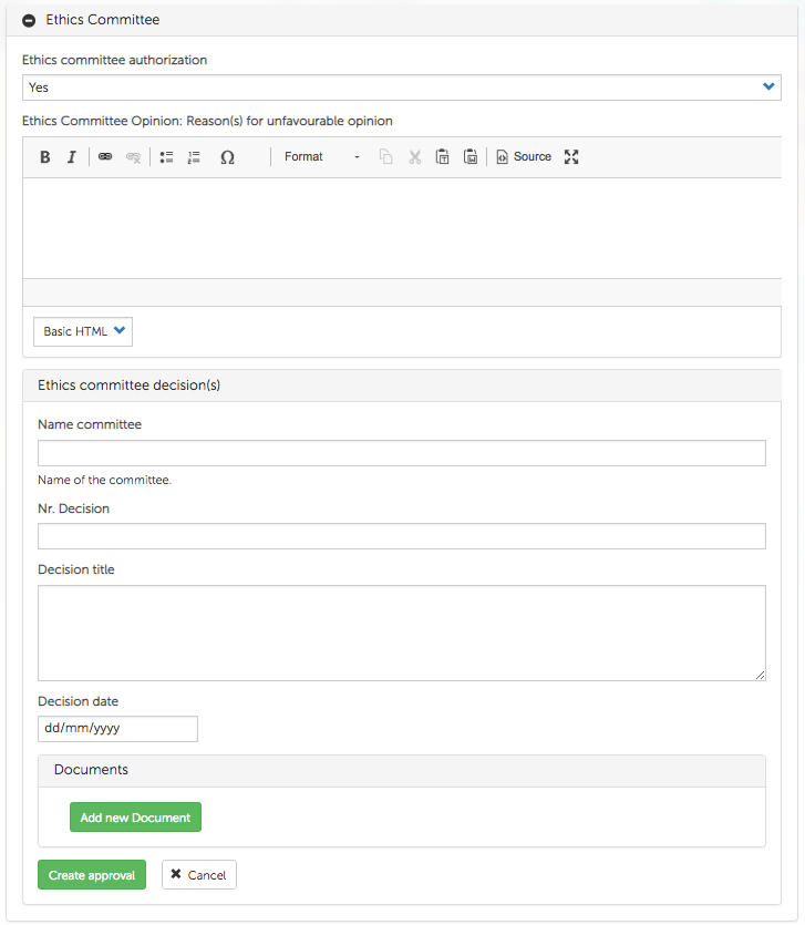 To provide information about Approval, first you need to indicate if a certain authorization is available by selection an option from a drop-down. If selected option is 'Yes', then additional Approval-related fields become available for entry and need to be completed.