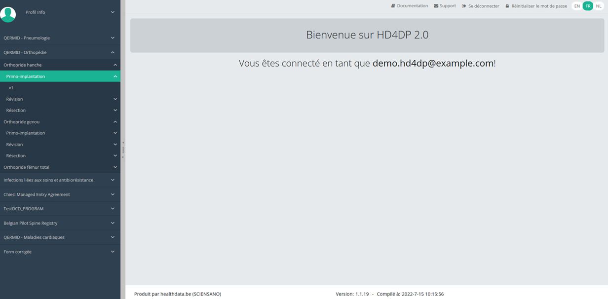 Envoyer un enregistrementSupposons que nous voulions envoyer un enregistrement « Primo-implantation » du projet d'étude Orthopride Hanche. Dans ce cas, nous devons naviguer vers le programme d'étude QERMID Orthopédie et ensuite vers le projet d'étude Orthopride Hanche. Là, nous devons sélectionner « Primo-implantation » dans le menu bleu foncé de gauche.