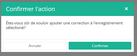 Après avoir appuyé sur « Ajouter correction », une fenêtre pop-up apparaîtra pour vous demander de confirmer l'action d'ajouter un enregistrement de correction pour l'enregistrement sélectionné. Si vous êtes sûr de cette action, cliquez sur « Confirmer ». Sinon, appuyez sur « Annuler ».