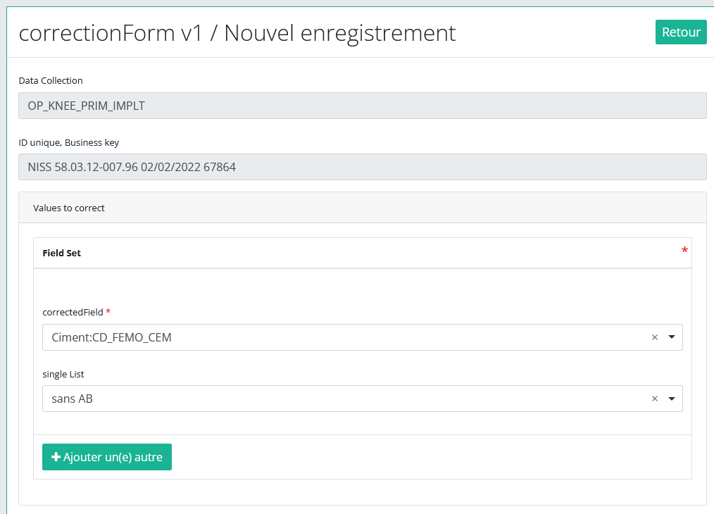 Le nombre de champs à corriger dans un même enregistrement de correction est limité à trois. Vous pouvez ajouter un autre champ à corriger en cliquant sur le bouton « Ajouter un(e) autre ».