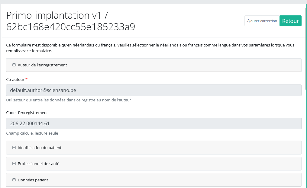 Si vous confirmez, vous serez redirigé vers le formulaire de correction de l'enregistrement.