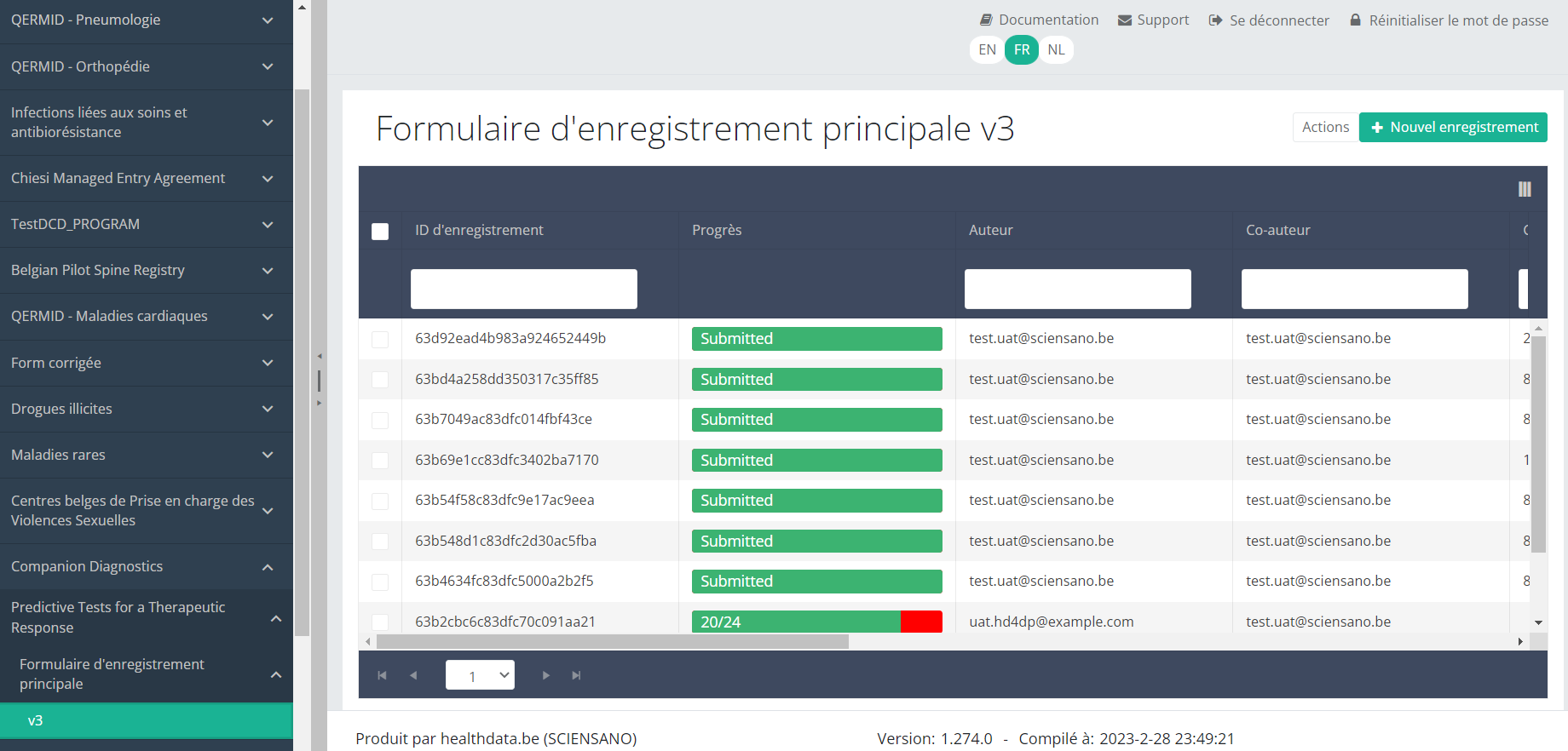 Lorsque vous sélectionnez une version de cette section d'étude, vous verrez le tableau récapitulatif dans la partie principale de votre écran. Ce tableau contient, entre autres, les éléments suivants : ID d'enregistrement, Progrès, Auteur, Co-auteur, ID unique, Business key, Code d'enregistrement, Numéro de registre national du patient...