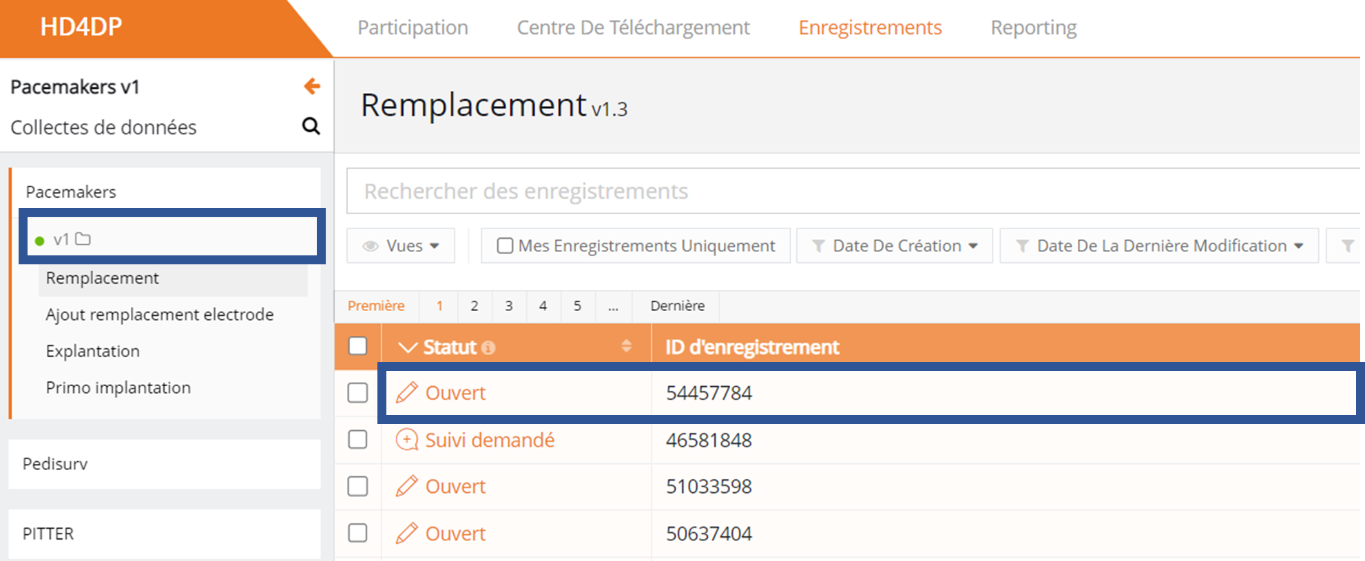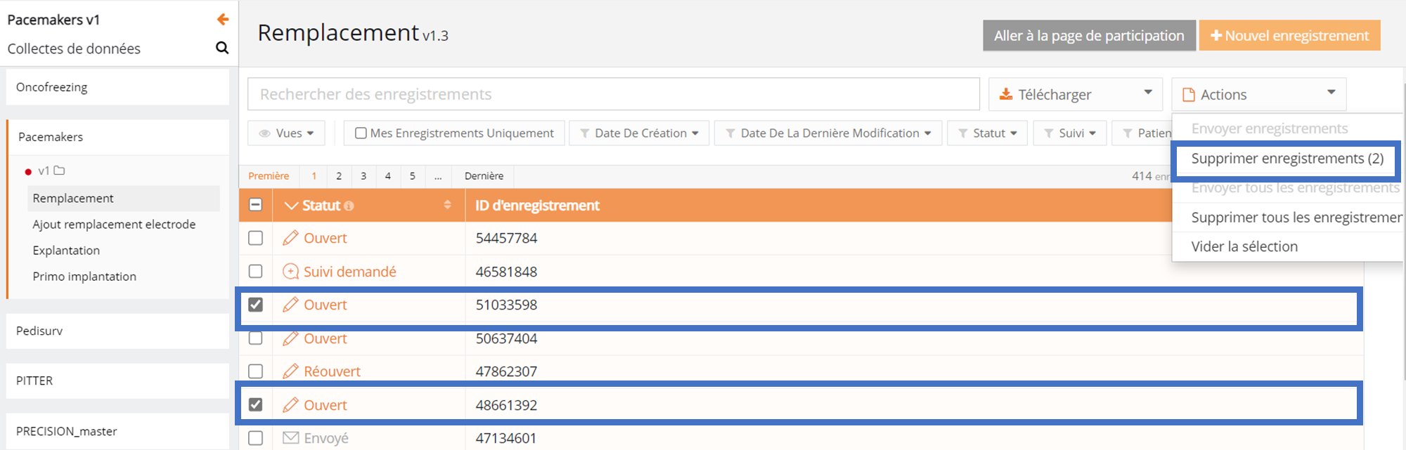 Seuls les enregistrements dont les statuts sont « ouvert » et « corrections nécessaires » peuvent être supprimés.