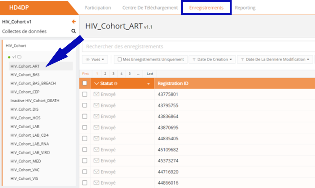 L'onglet Enregistrements conduit l'utilisateur aux registres existants. Un utilisateur peut commencer à collecter des données à partir de cet onglet.