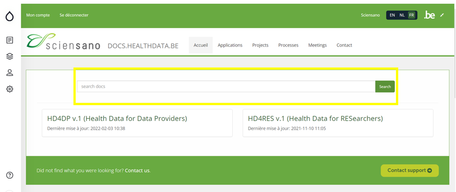 Choisissez "Support center" pour être redirigé vers la page de support de Healthdata. Des articles sur l'utilisation de HD4DP sont disponibles sur cette page.