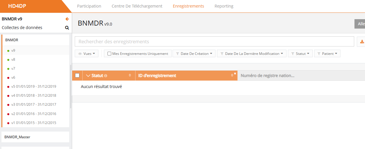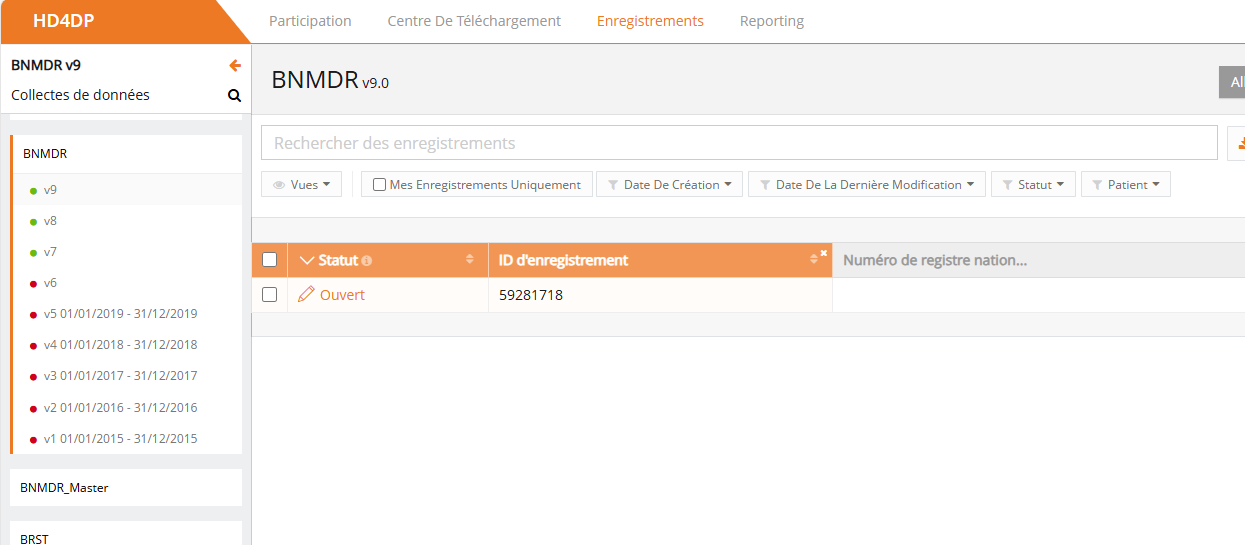L'onglet Enregistrements conduit l'utilisateur aux registres existants. Un utilisateur peut commencer à collecter des données à partir de cet onglet.