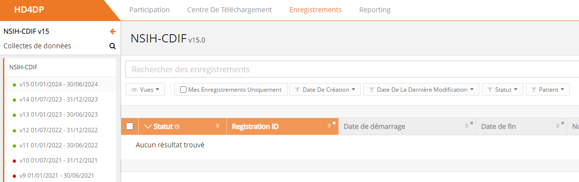 L'onglet Enregistrements conduit l'utilisateur aux registres existants. Un utilisateur peut commencer à collecter des données à partir de cet onglet.
