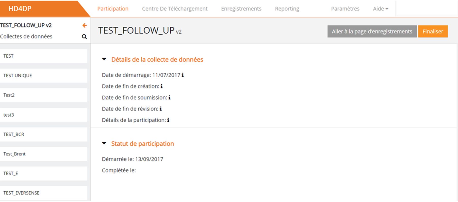 Lorsqu'une version est sélectionnée, l'utilisateur a un aperçu de l'historique et de l'état actuel du registre dans la partie droite de la page, grâce aux différentes sections et dates clés, et il a la possibilité de consulter le rapport ou de finaliser la collecte de données à l'aide des boutons d'action.