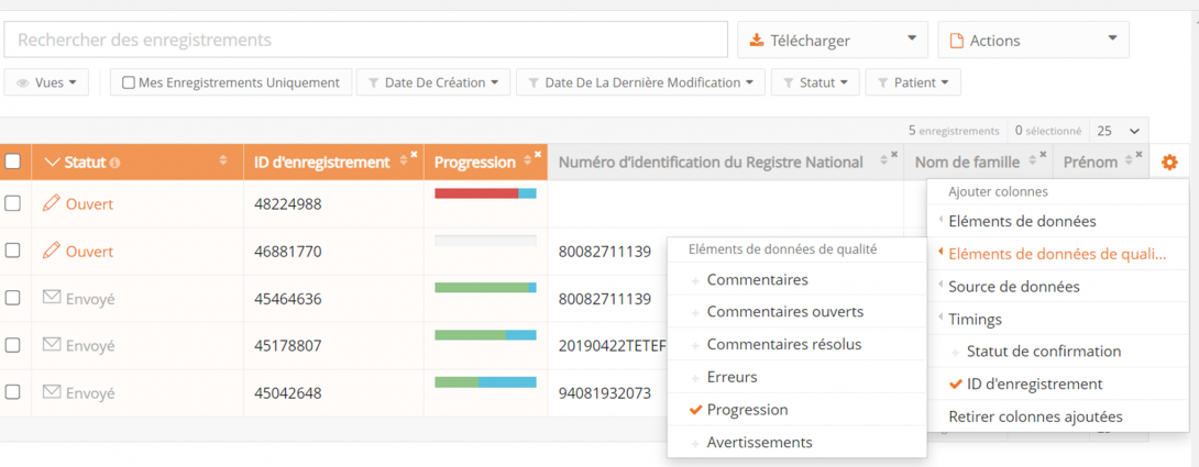 Une colonne intéressante à ajouter à la vue d'ensemble est la barre de progression où vous pouvez voir le statut de chaque enregistrement. La barre représente le statut des champs, à savoir valide, invalide ou facultatif.