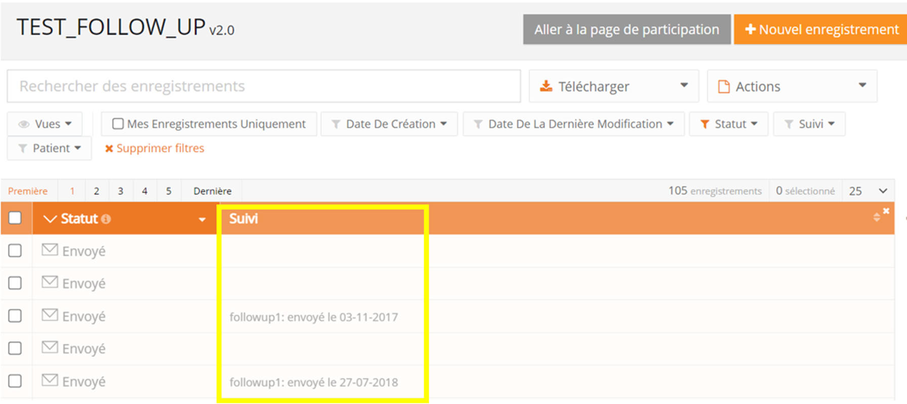 Enregistrements avec le statut "Suivi demandé"