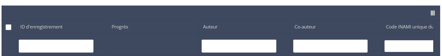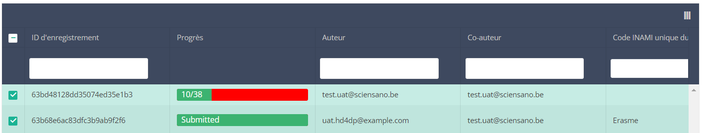 Lorsque vous sélectionnez une version de cette section d'étude, vous verrez le tableau récapitulatif dans la partie principale de votre écran. Ce tableau contient, entre autres, les éléments suivants : ID d'enregistrement, Progrès, Auteur, Co-auteur, ID unique, Business key, Code d'enregistrement, Numéro de registre national du patient...