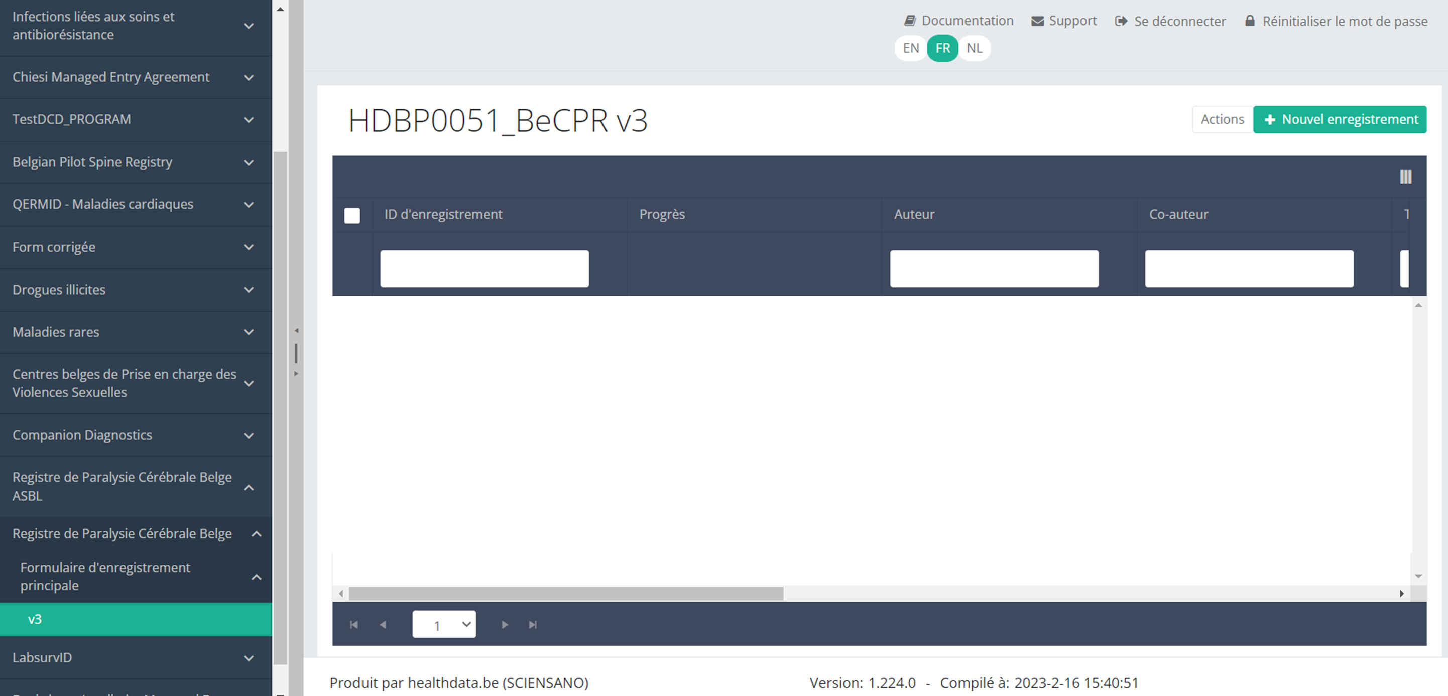 Pour créer un enregistrement pour le projet d'étude Registre de Paralysie Cérébrale Belge, sélectionnez « Formulaire d'enregistrement principal » dans le menu bleu foncé de gauche.