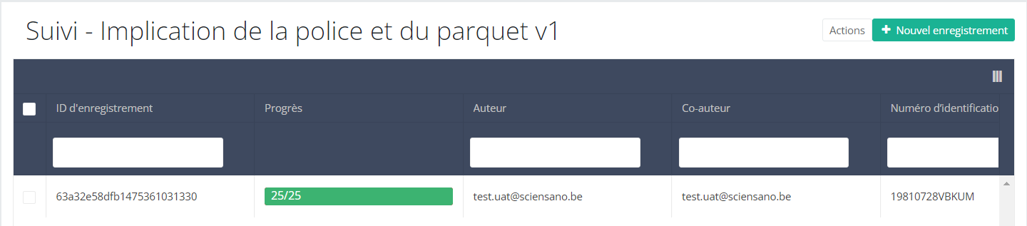 Lorsque vous sélectionnez une version de cette section d'étude, vous verrez le tableau récapitulatif dans la partie principale de votre écran. Ce tableau contient, entre autres, les éléments suivants : ID d'enregistrement, Progrès, Auteur, Co-auteur, ID unique, Business key, Code d'enregistrement, Numéro de registre national du patient...
