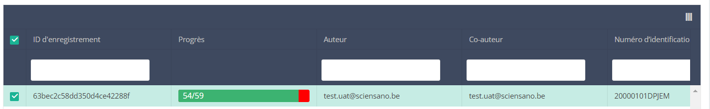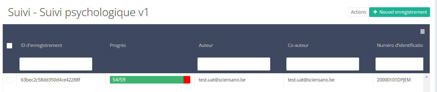 Lorsque vous sélectionnez une version de cette section d'étude, vous verrez le tableau récapitulatif dans la partie principale de votre écran. Le tableau comprend les éléments suivants : ID d'enregistrement, Progrès, Auteur, Co-auteur, ID unique, Business key, Code d'enregistrement, Numéro de registre national du patient...