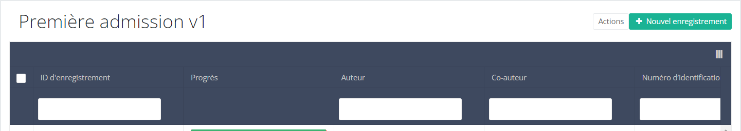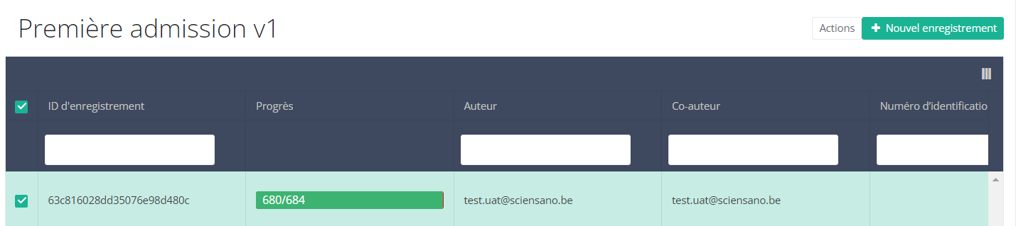 Lorsque vous sélectionnez une version de cette section d'étude, vous verrez le tableau récapitulatif dans la partie principale de votre écran. Ce tableau contient, entre autres, les éléments suivants : ID d'enregistrement, Progrès, Auteur, Co-auteur, ID unique, Business key, Code d'enregistrement, Numéro de registre national du patient...