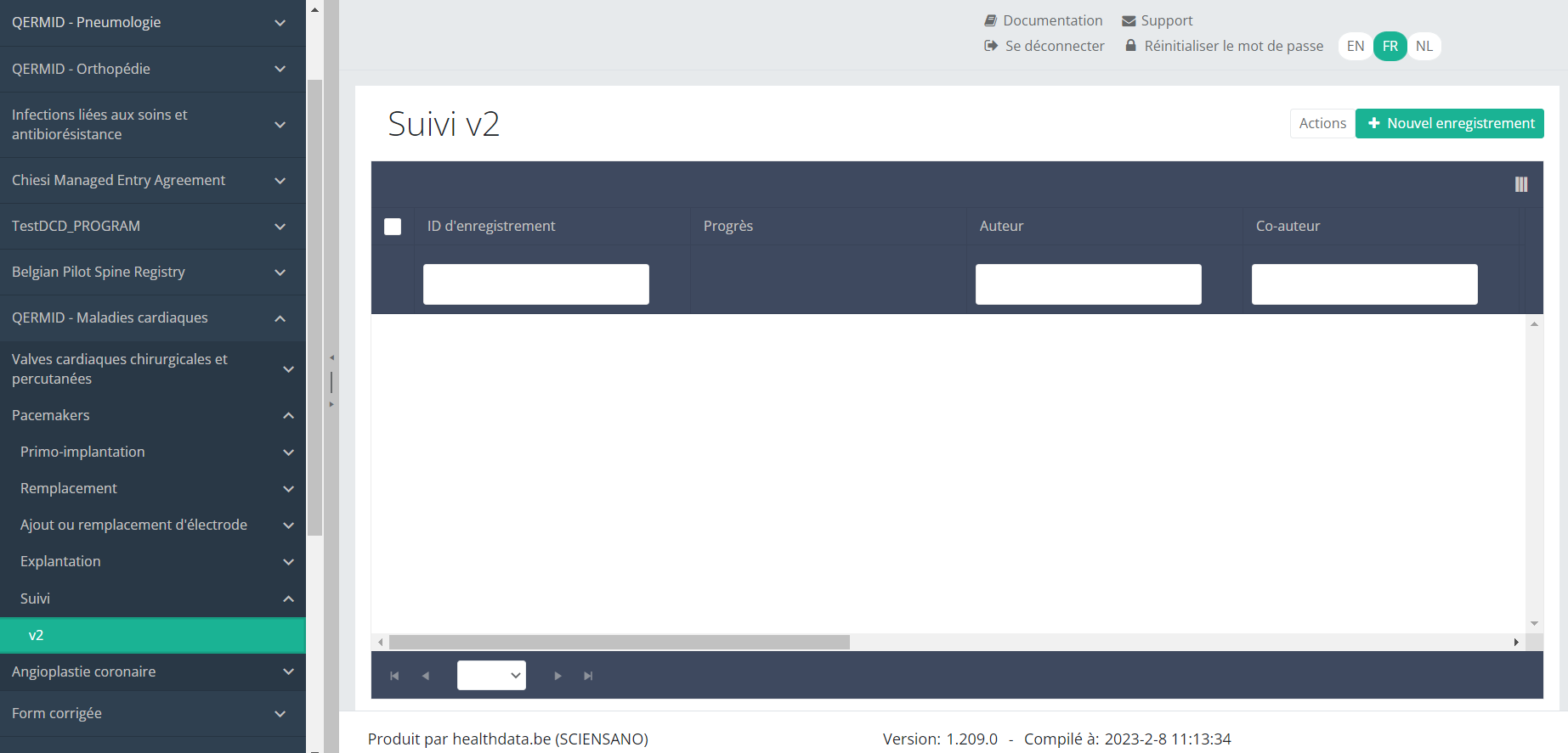 Lorsque vous sélectionnez la version la plus élevée de cette section d'étude pour la première fois, vous verrez un tableau récapitulatif vide dans la partie principale de votre écran. Ce tableau contient, entre autres, les éléments suivants : ID d'enregistrement, Progrès, Auteur, Co-auteur, ID unique, Business Key, Code d'enregistrement, Numéro de registre national du patient...