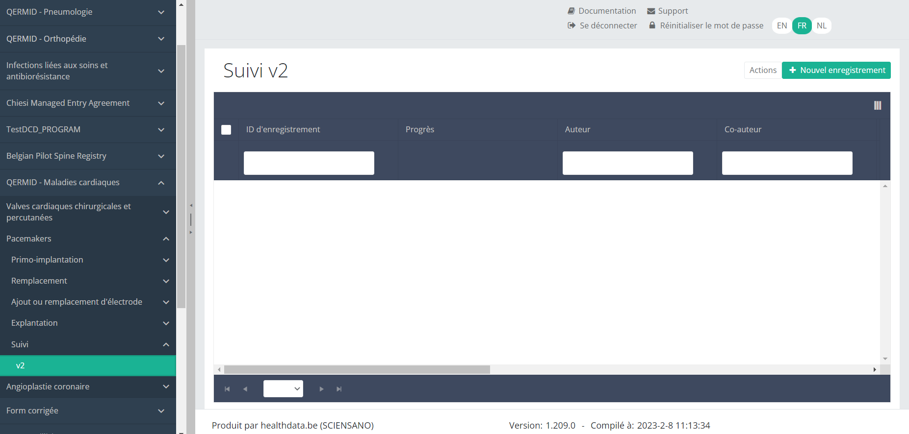 Lorsque vous sélectionnez une version de cette section d'étude, vous verrez le tableau récapitulatif dans la partie principale de votre écran. Ce tableau contient, entre autres, les éléments suivants : ID d'enregistrement, Progrès, Auteur, Co-auteur, ID unique, Business Key, Code d'enregistrement, Numéro de registre national du patient…