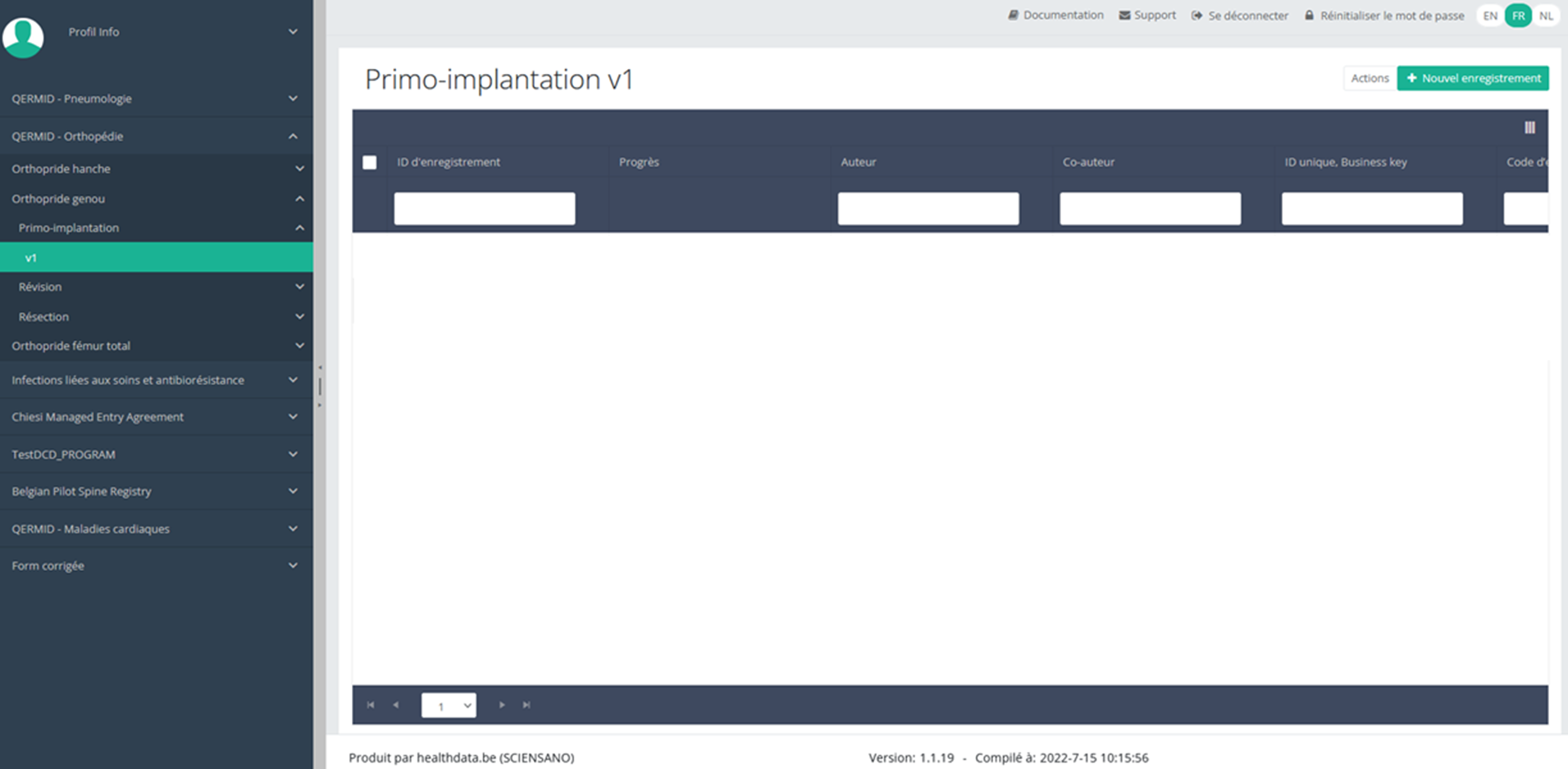 Pour créer un enregistrement de « Primo-implantation » pour le projet d'étude Orthopride Genou, sélectionnez « Primo-implantation » dans le menu bleu foncé de gauche.