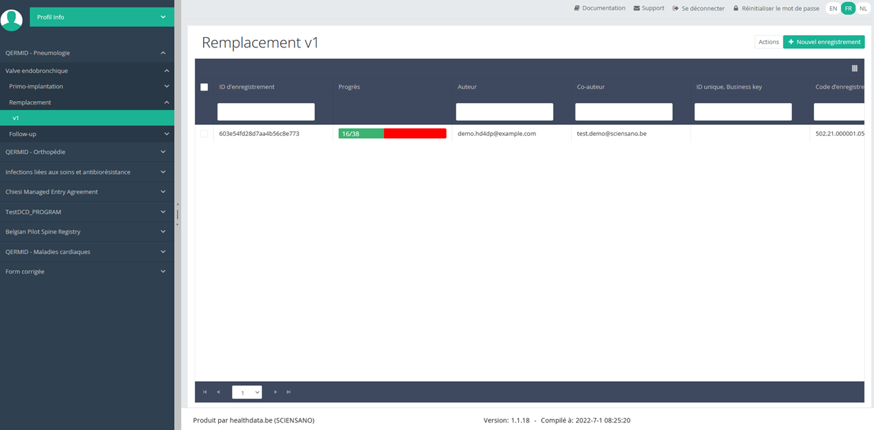 Lorsque le formulaire d'étude est rempli mais qu'il y a des erreurs de validation, vous pouvez Sauver mais pas Envoyer cet enregistrement. Remarquez que le bouton Envoyer est en vert clair.