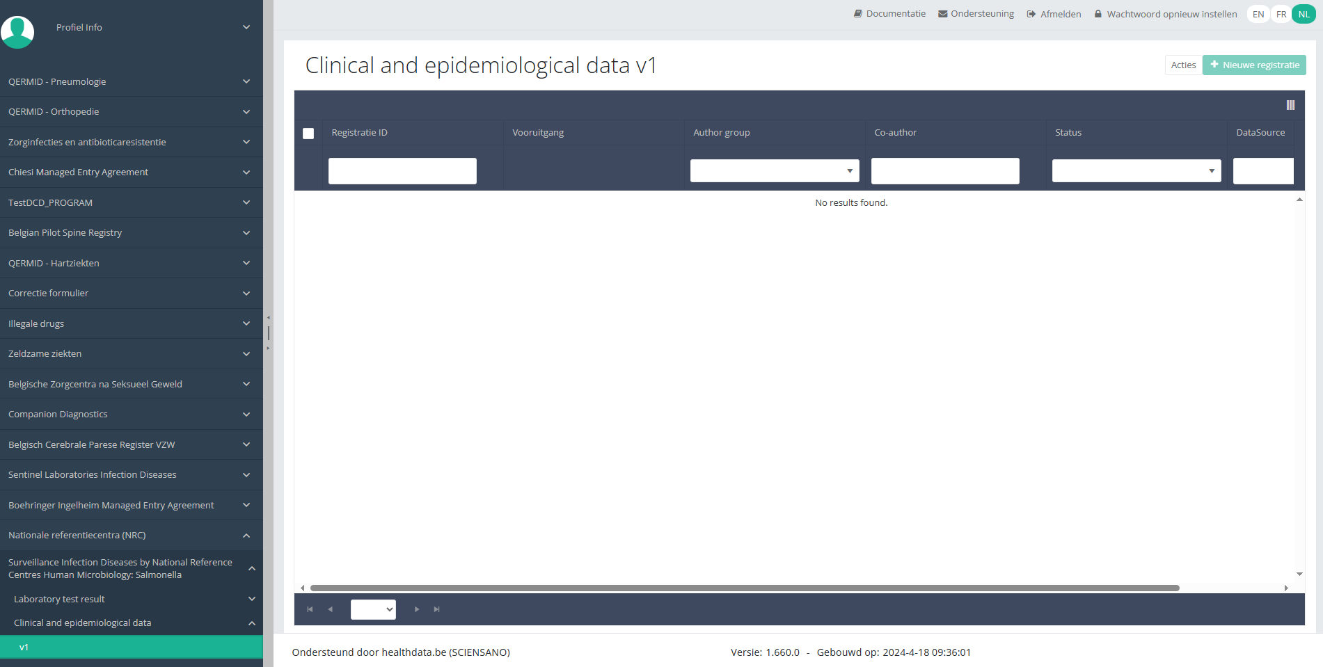 Een NRC "Clinical and epidemiological" registratie vindenOm een Clinical and epidemiological data registratie te vinden voor het studieproject NRC, selecteert u "Clinical and epidemiological data" in het donkerblauwe menu links op het scherm.
