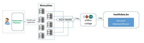 - Gegevens uit de Databank overeenkomsten (CIVARS) worden verzameld via RIZIV-INAMI. De gegevens worden, via eHealth voor pseudonimisering doorgestuurd naar het healthdata.be Data Warehouse (HD-DWH) waar de exploitatie van de gegevens kan plaatsvinden.