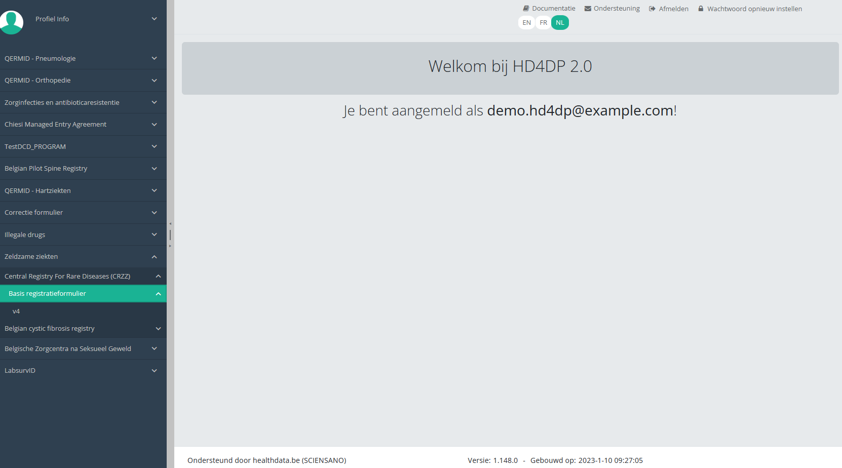 Algemene beschrijving van de applicatie HD4DP v2De HD4DP v2.x Local is een elektronisch gegevensregistratiesysteem (EDC): een geautomatiseerd systeem dat is ontworpen voor het verzamelen van klinische gegevens in elektronisch formaat voor gebruik in onderzoek ter ondersteuning van het volksgezondheidsbeleid. HD4DP (Health Data for Data providers) vervangt de traditionele op papier, spreadsheet, e-mail gebaseerde methode voor het verzamelen van gegevens en de wildgroei aan websites om het verzamelen van gegevens te stroomlijnen en de tijd tot analyse en rapportage te versnellen.