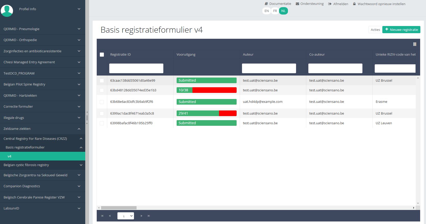 Wanneer u een versie van dit studieonderdeel selecteert, ziet u de overzichtstabel in het hoofdgedeelte van uw scherm. Deze tabel bevat onder andere volgende items: Registratie ID, Vooruitgang, Auteur, Co-auteur, Unieke ID, Business Key, Registratiecode, Rijksregisternummer van de patiënt ...