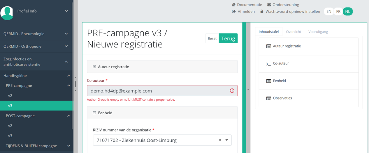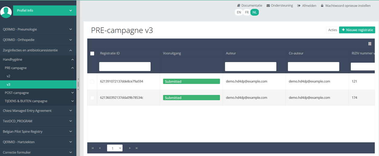 Om een "PRE-campagne" registratie te verzenden voor het studieproject Handhygiëne via de overzichtstabel, selecteer "PRE-campagne" in het donkerblauwe linkermenu.