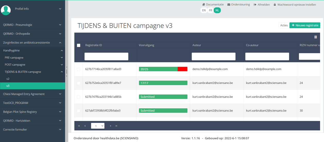 Wanneer u een versie van dit studieonderdeel selecteert, ziet u de overzichtstabel in het hoofdgedeelte van uw scherm. Deze tabel bevat onder andere: Registratie ID, Vooruitgang, Auteur, Co-auteur, Unieke ID, Business Key, Registratiecode, Rijksregisternummer van de patiënt…