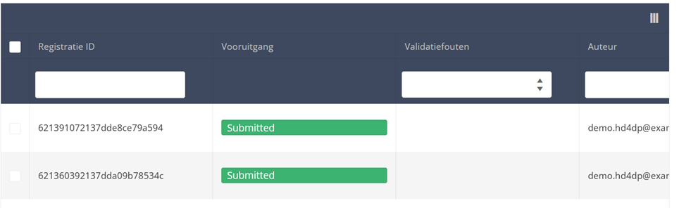 Gebruik de filters in de koptekst van de tabel om de registratie(s) te vinden die u wilt verzenden. U kunt bijvoorbeeld de filters "Status" (ingesteld op "Open") en "Validatiefouten" (ingesteld op "0") gebruiken om de registraties te krijgen die kunnen worden verzonden.