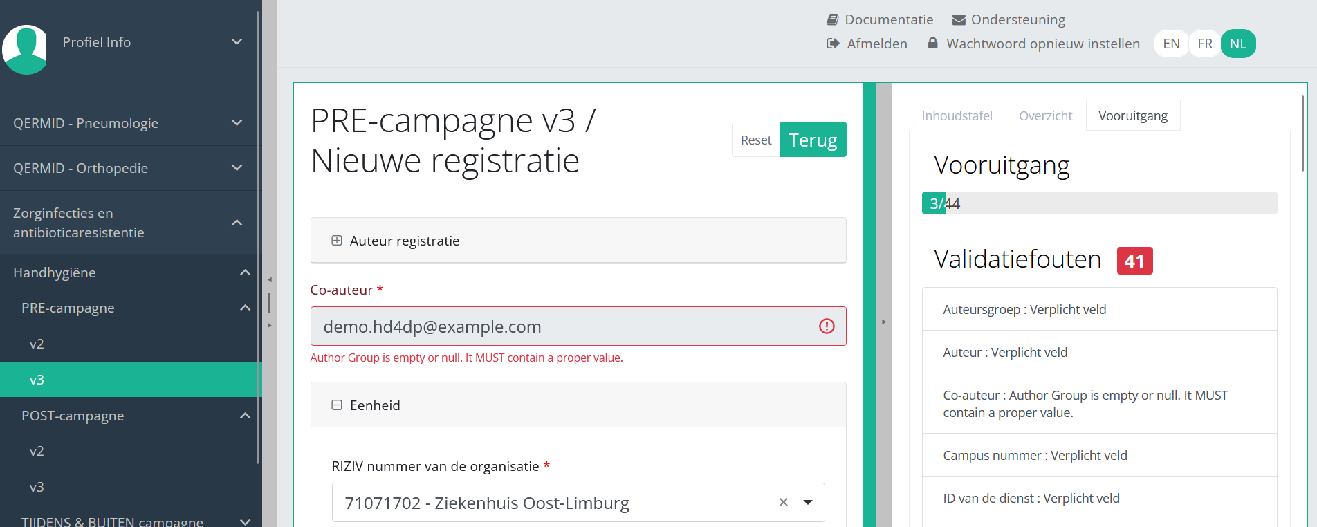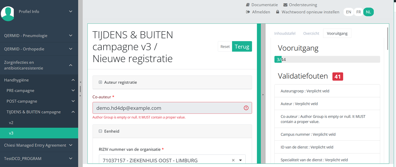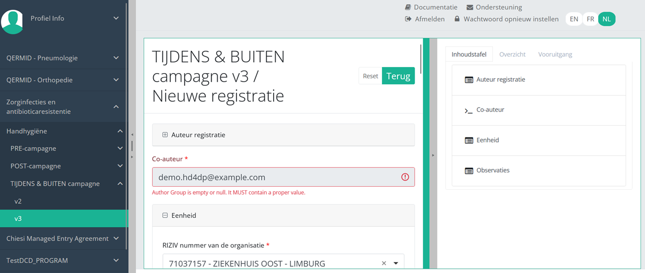 Open eerst de webapplicatie HD4DP v2.0, navigeer naar het studieprogramma en selecteer het gewenste studieproject in het linker donkerblauwe menu. Vul het volledige registratieformulier vervolgens handmatig in met de juiste waarden en verzend het opnieuw.