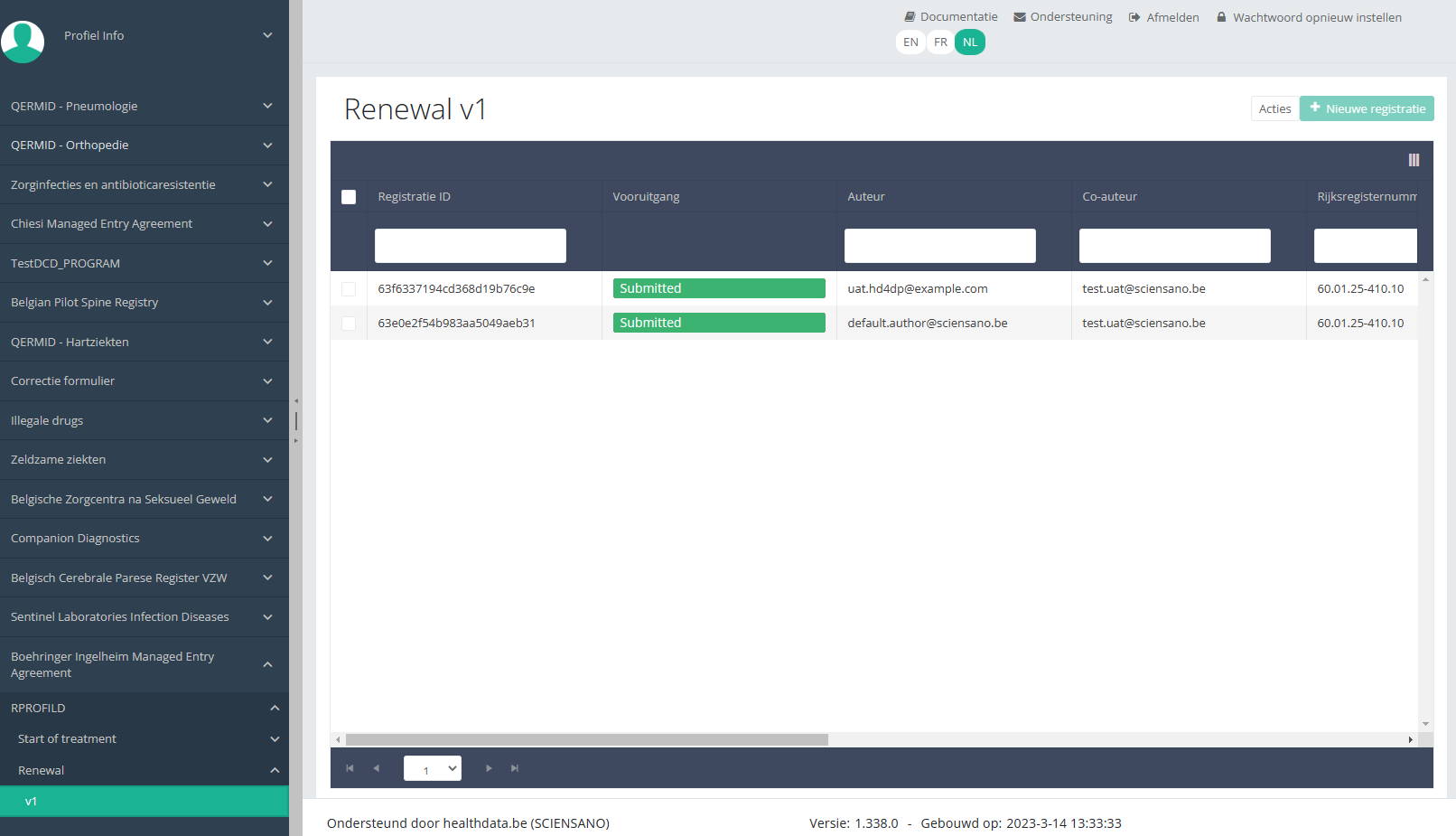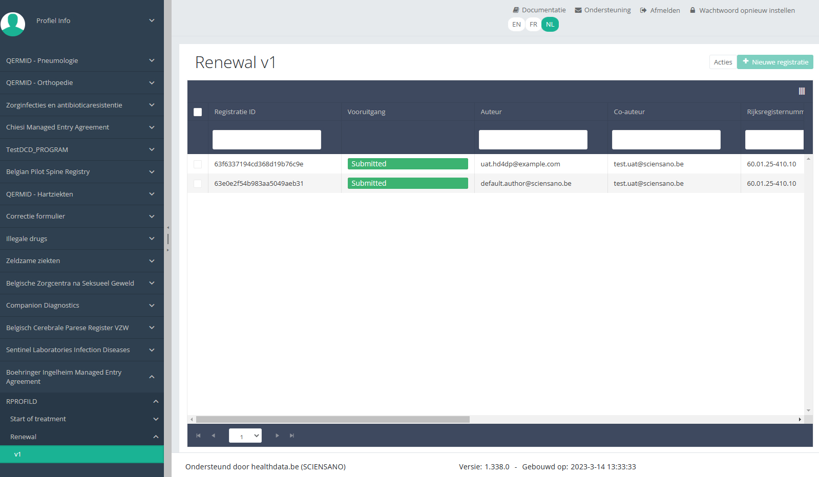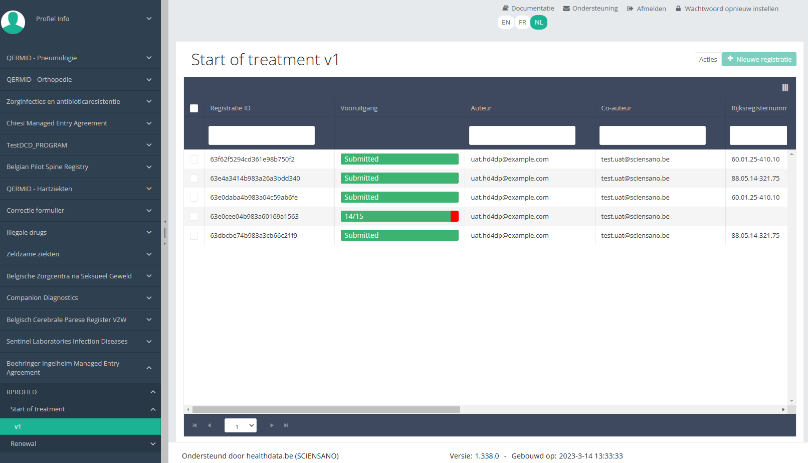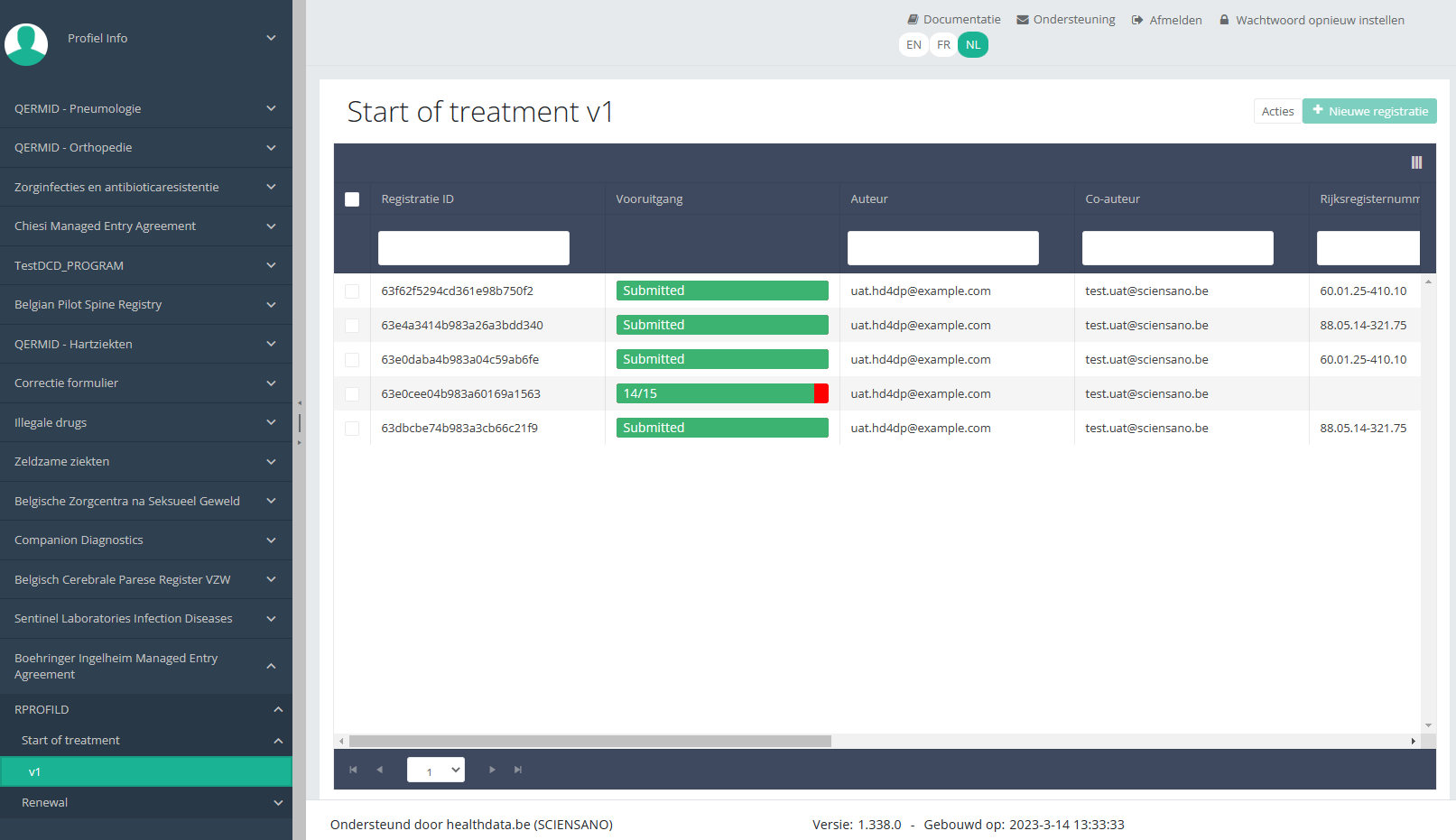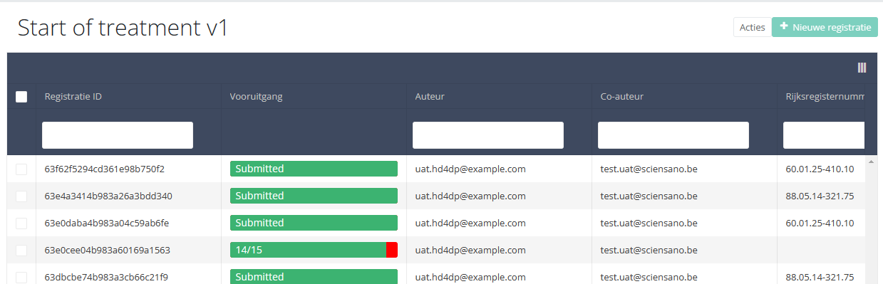 Wanneer u een versie van dit studieonderdeel selecteert, ziet u de overzichtstabel in het hoofdgedeelte van uw scherm. Deze tabel bevat onder andere volgende items: Registratie ID, Vooruitgang, Auteur, Co-auteur, Unieke ID, Business Key, Registratiecode, Rijksregisternummer van de patiënt ……