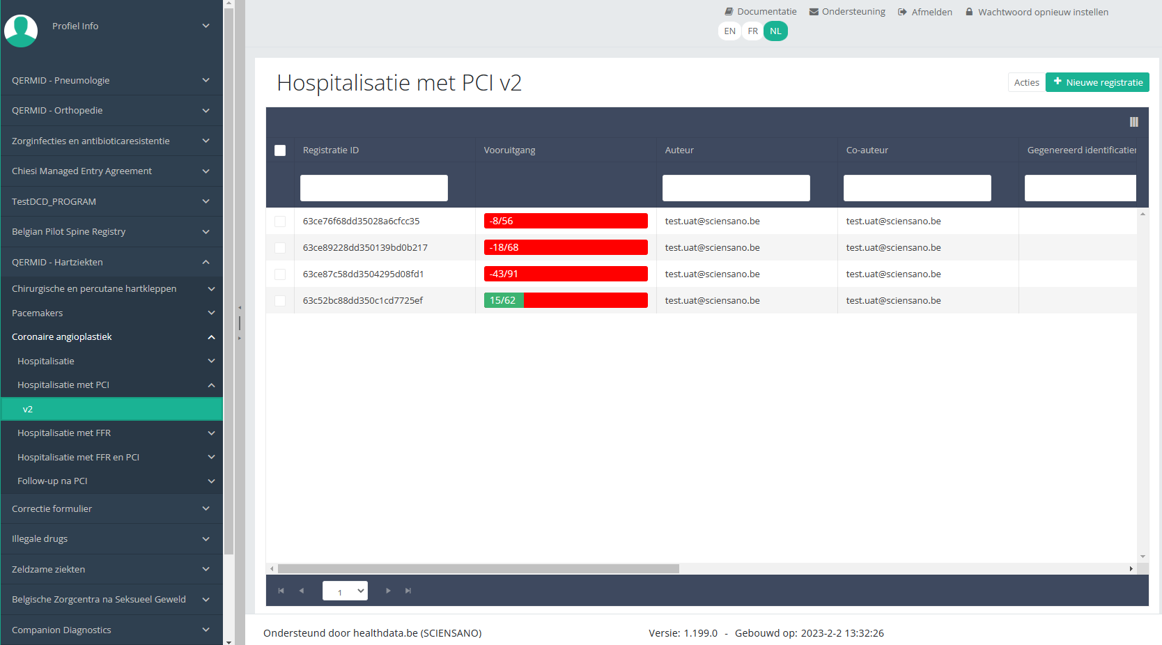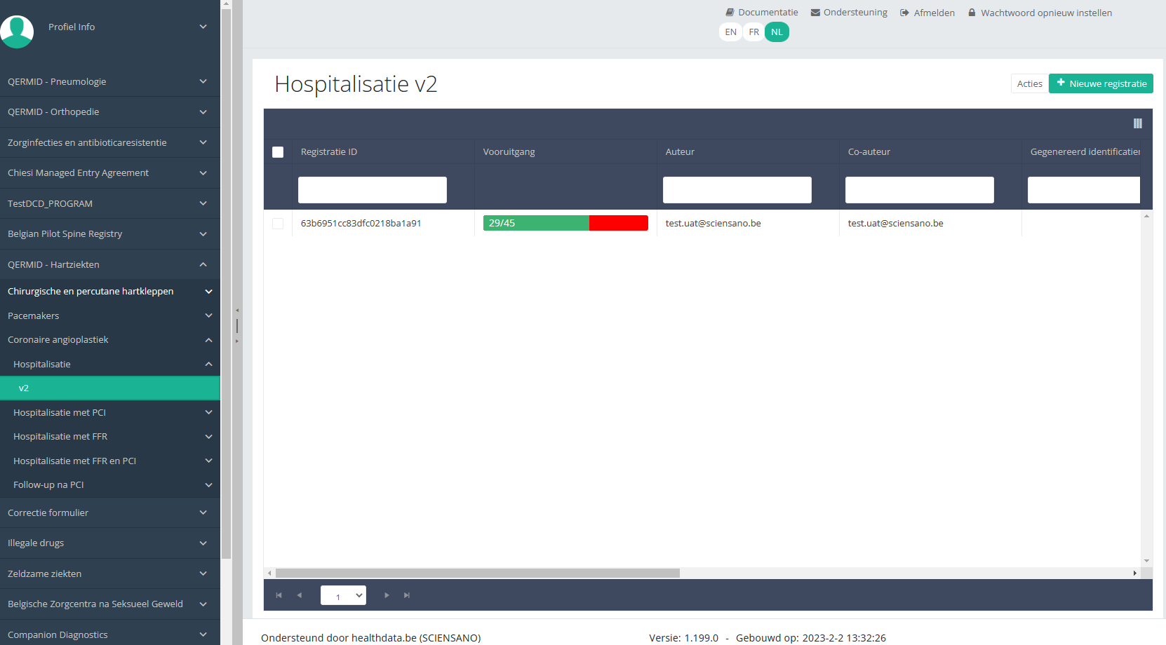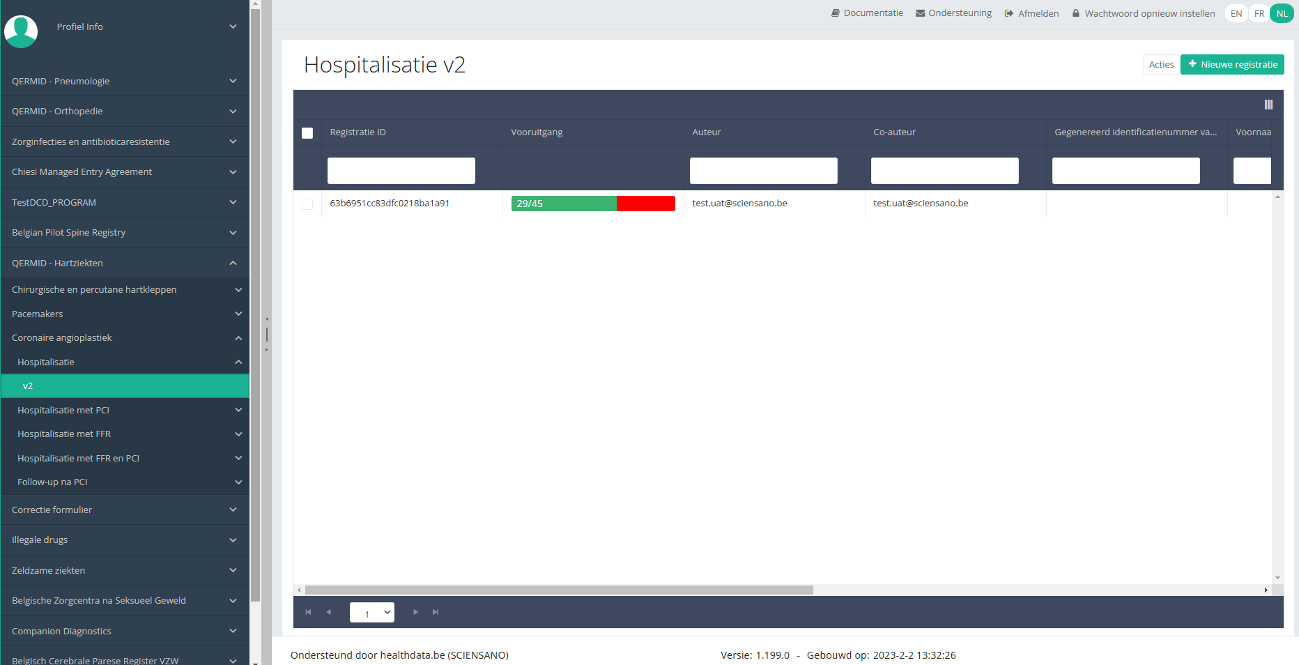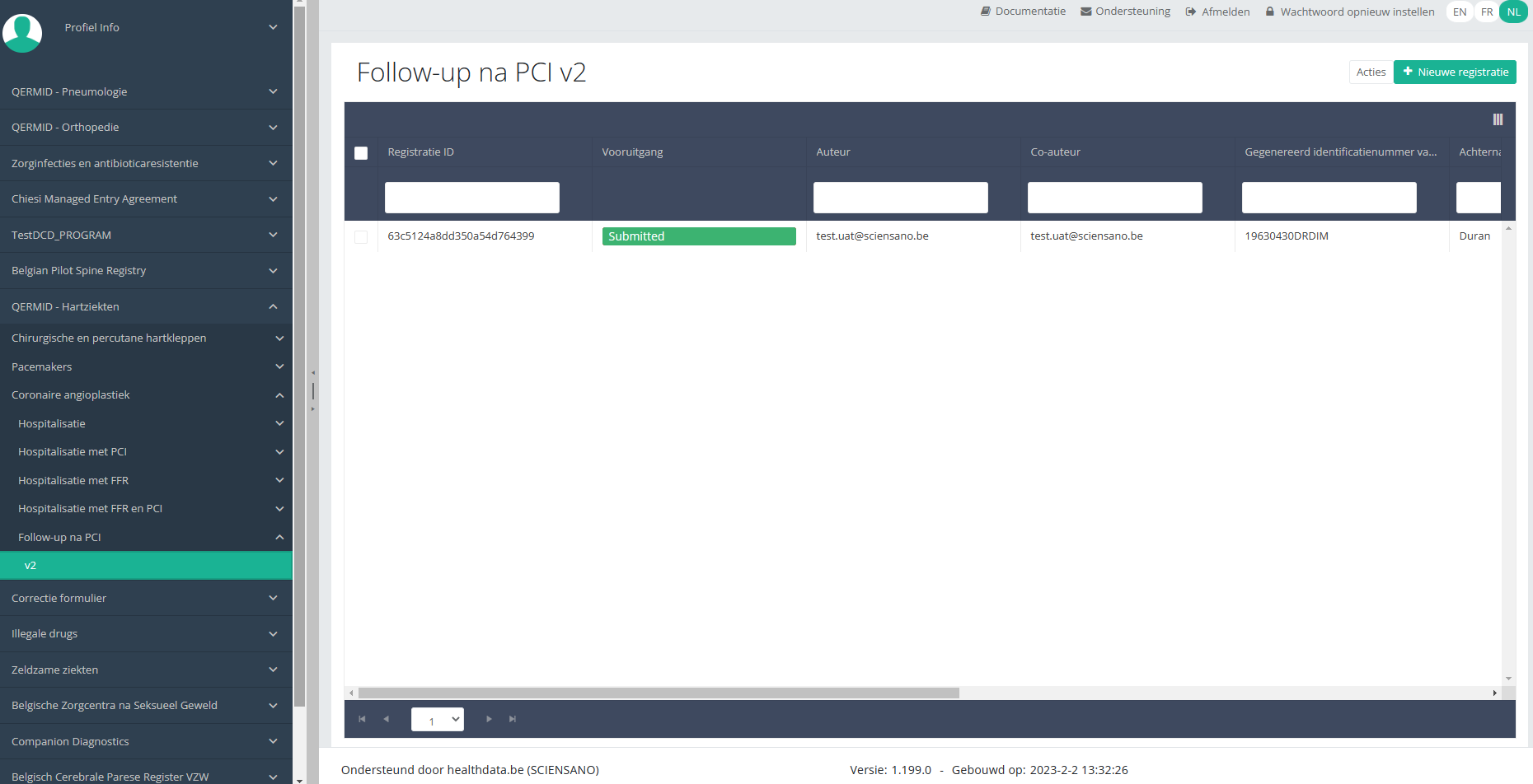 Deze documentatie wordt regelmatig bijgewerkt. We proberen de informatie zo correct, volledig en zo duidelijk mogelijk weer te geven. Als u desondanks iets in de documentatie ziet dat niet correct is, niet overeenkomt met uw ervaring, of verdere verduidelijking vereist, maak dan een support ticket via ons portaal (https://healthdatabe.atlassian.net/servicedesk/customer/portals) of stuur ons een e-mail via support.healthdata@sciensano.be om dit documentatieprobleem te melden. Vergeet niet de URL of het webadres van de pagina met het documentatieprobleem te vermelden. Wij zullen de documentatie dan aanpassen. Bedankt!