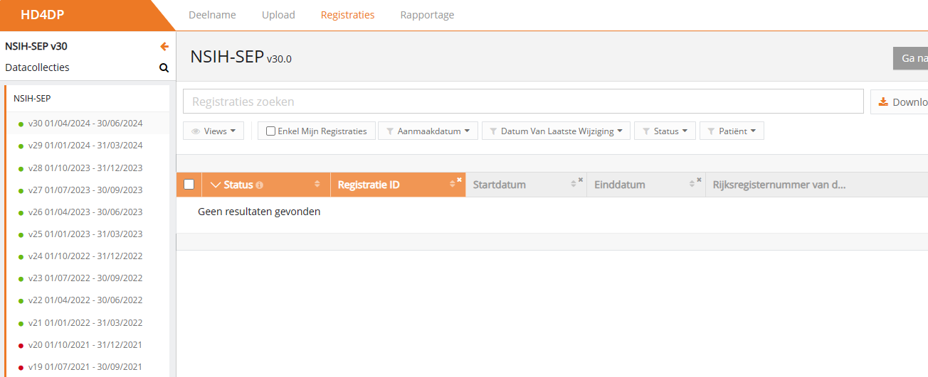 Een registratie creëren in HD4DP v1In het Data Collection-scherm ziet de gebruiker de bestaande registers. Vanuit dit scherm kan een gebruiker dan een datacollectie starten.