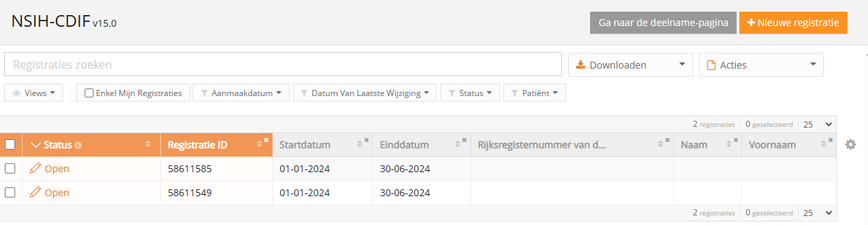 - Open voor registraties die handmatig werden opgeslagen of door een csv-bestand up te loaden.