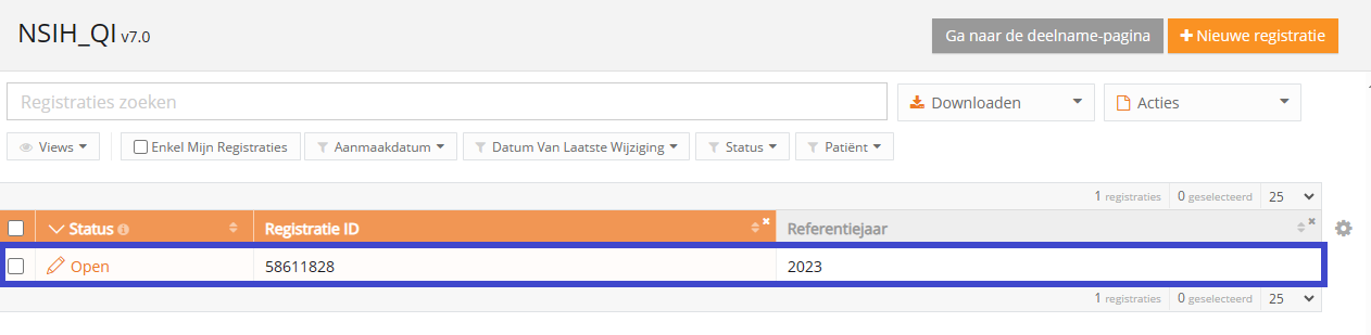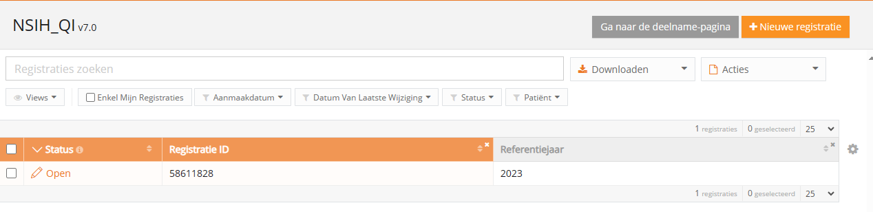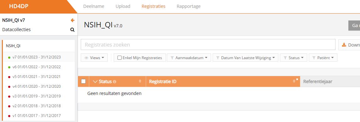 Een registratie creëren in HD4DP v1In het Data Collection-scherm ziet de gebruiker de bestaande registers. Vanuit dit scherm kan een gebruiker dan een datacollectie starten.