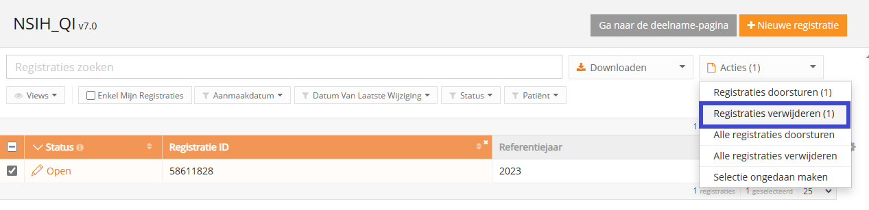 - Selecteer de knop 'Acties' en kies de optie 'Registraties verwijderen'