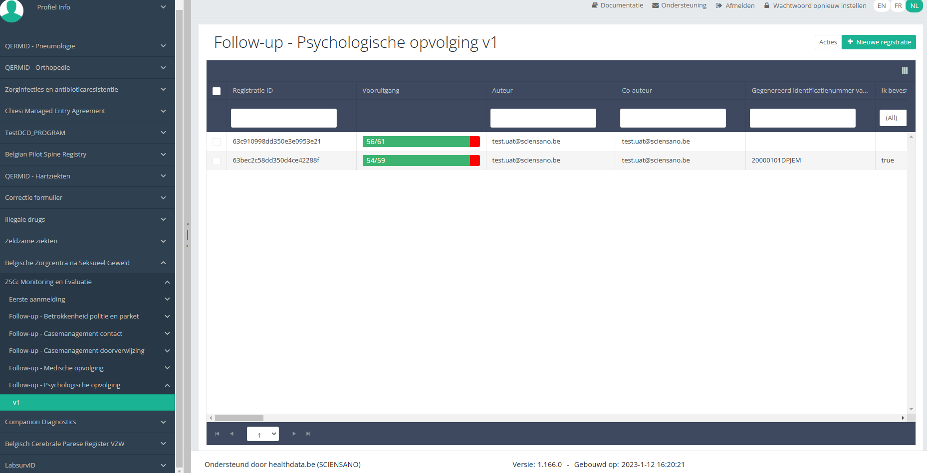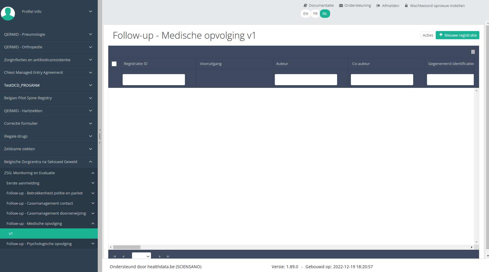 Wanneer u voor de eerste keer de hoogste versie van dit studieonderdeel selecteert, ziet u een lege overzichtstabel in het hoofdgedeelte van uw scherm. De tabel bevat onder andere de volgende items: Registratie ID, Vooruitgang, Auteur, Co-auteur, Unieke ID, Business Key, Registratiecode, Rijksregisternummer van de patiënt...