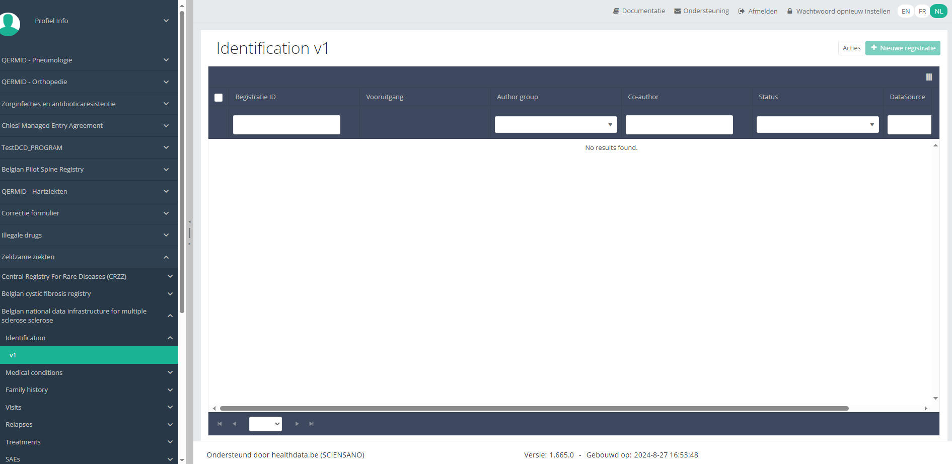 Wanneer u voor de eerste keer de hoogste versie van dit studieonderdeel selecteert, ziet u een lege overzichtstabel in het hoofdgedeelte van uw scherm. De tabel bevat onder andere de volgende items: Registratie ID, Vooruitgang, Auteur, Co-auteur, Unieke ID, Business Key, Registratiecode, Rijksregisternummer van de patiënt...