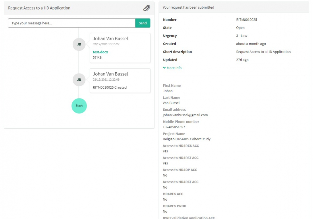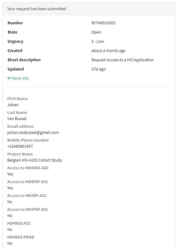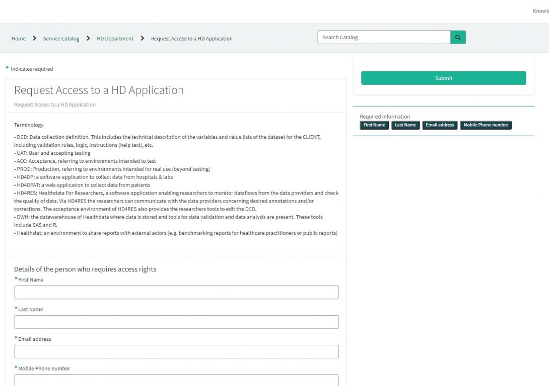 To request access to the component HD4RES v2 of the healthdata.be platform, you first need to log in to the HD Service and Support portal. This portal is available via following URL: https://sciensano.service-now.com/sp