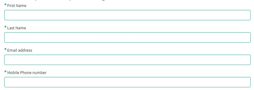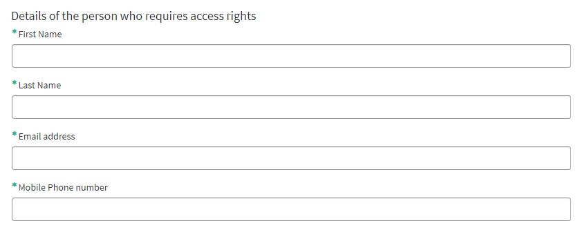 Please provide the details of the person who requires access rights: First Name, Last Name, Email address, Mobile Phone number.