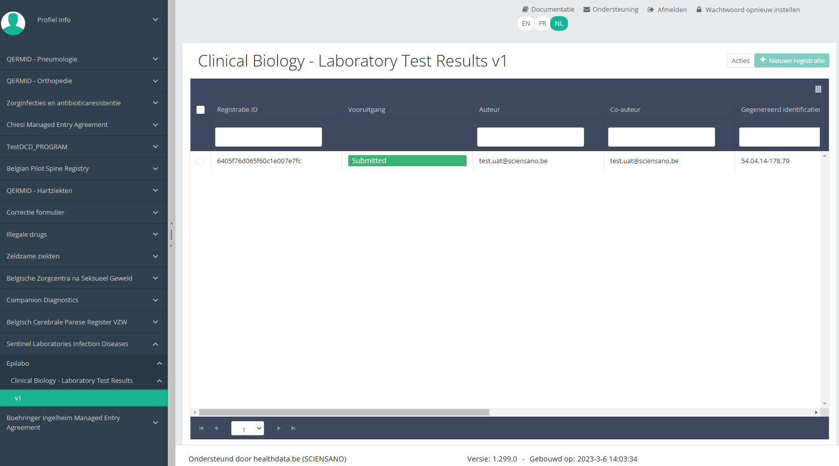 Deze documentatie wordt regelmatig bijgewerkt. We proberen de informatie zo correct, volledig en zo duidelijk mogelijk weer te geven. Als u desondanks iets in de documentatie ziet dat niet correct is, niet overeenkomt met uw ervaring, of verdere verduidelijking vereist, maak dan een support ticket via ons portaal (https://healthdatabe.atlassian.net/servicedesk/customer/portals) of stuur ons een e-mail via support.healthdata@sciensano.be om dit documentatieprobleem te melden. Vergeet niet de URL of het webadres van de pagina met het documentatieprobleem te vermelden. Wij zullen de documentatie dan aanpassen. Bedankt!