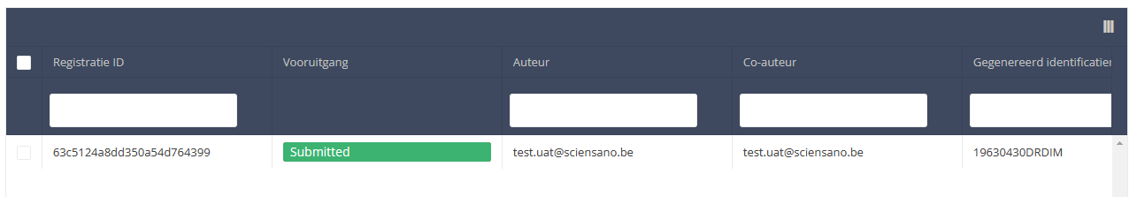 Wanneer u een versie van dit studieonderdeel selecteert, ziet u de overzichtstabel in het hoofdgedeelte van uw scherm. Deze tabel bevat onder andere volgende items: Registratie ID, Vooruitgang, Auteur, Co-auteur, Unieke ID, Business Key, Registratiecode, Rijksregisternummer van de patiënt...
