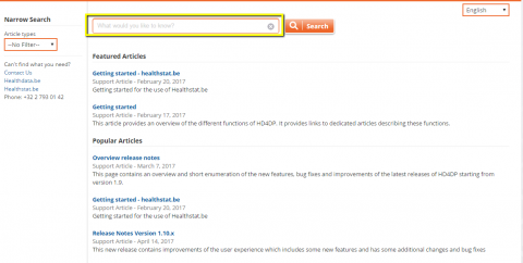 Kies 'Support' om te worden doorverwezen naar de ondersteuningspagina van Healthdata. Artikelen over het gebruik van HD4DP vindt u hier.
