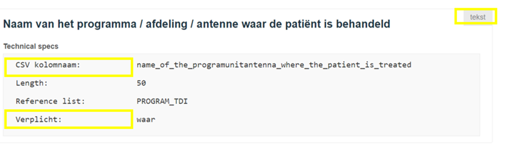 • Verplicht : 'waar' betekent dat het een verplicht veld is en dat het aanwezig moet zijn in het .csv-extract