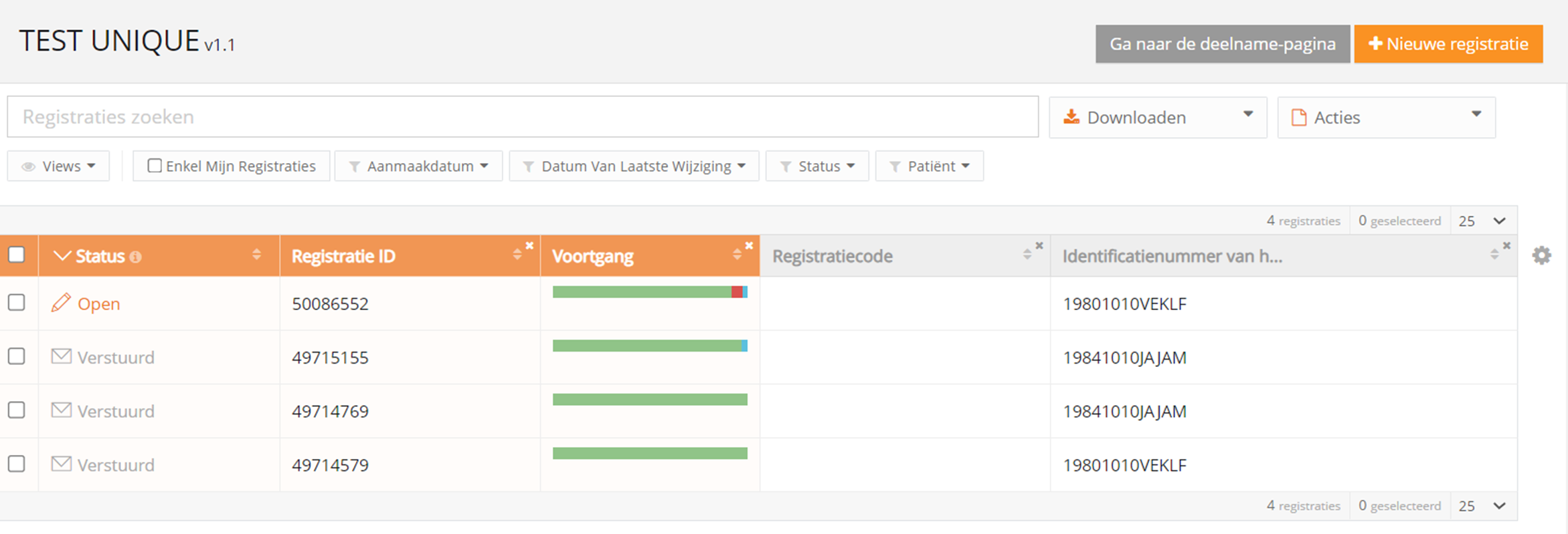 - Rood: verplichte velden en velden met een fout. Deze moeten worden opgelost voordat de registratie kan worden ingediend.